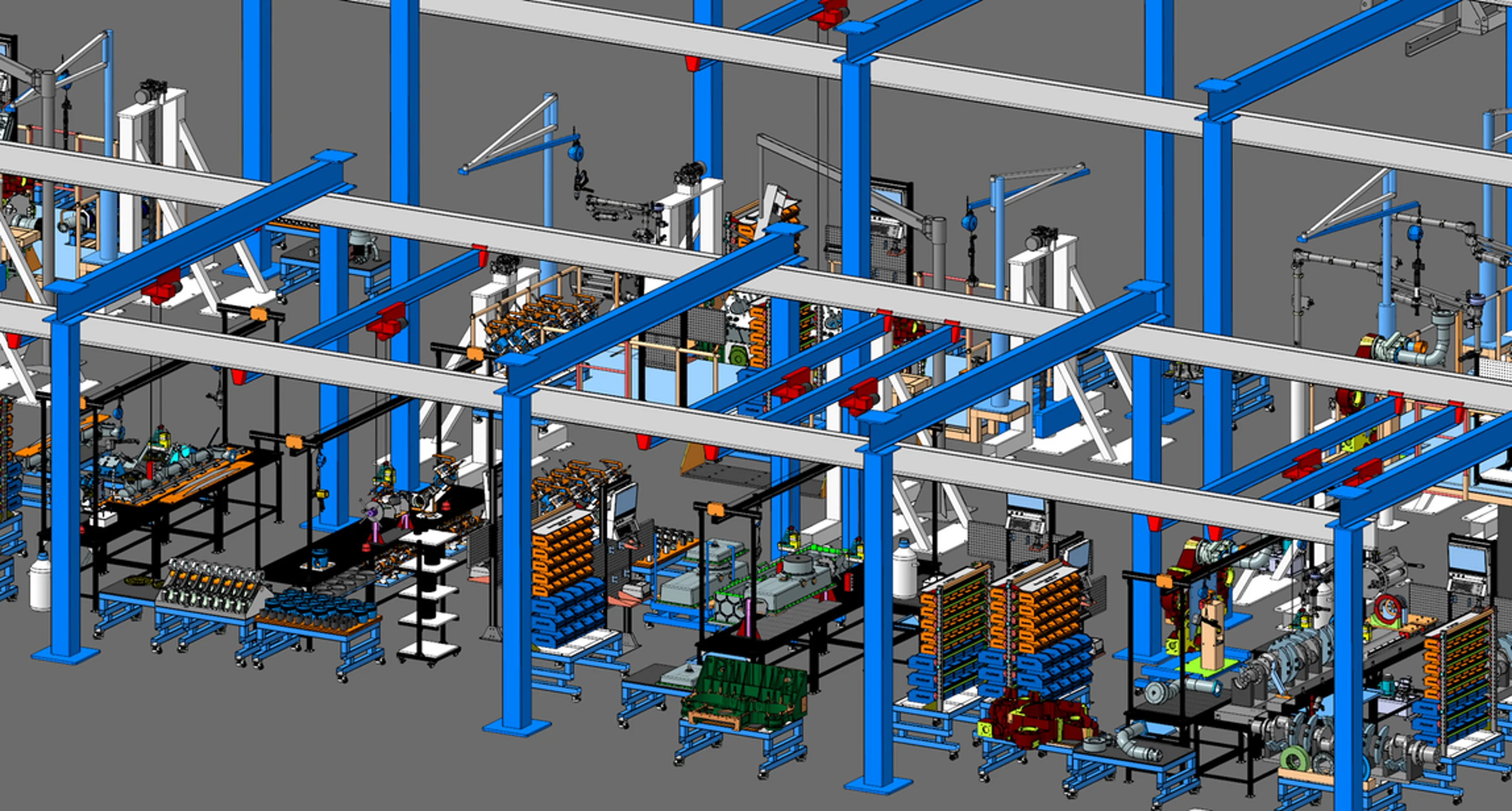 Планировка склада, сборочной линии, участков холодной обкатки, консервации, окраски и упаковки выполнена с использованием 3D-модели с учётом эргономики рабочих мест, снижения нагрузок на персонал и обеспечения требуемого такта сборки.