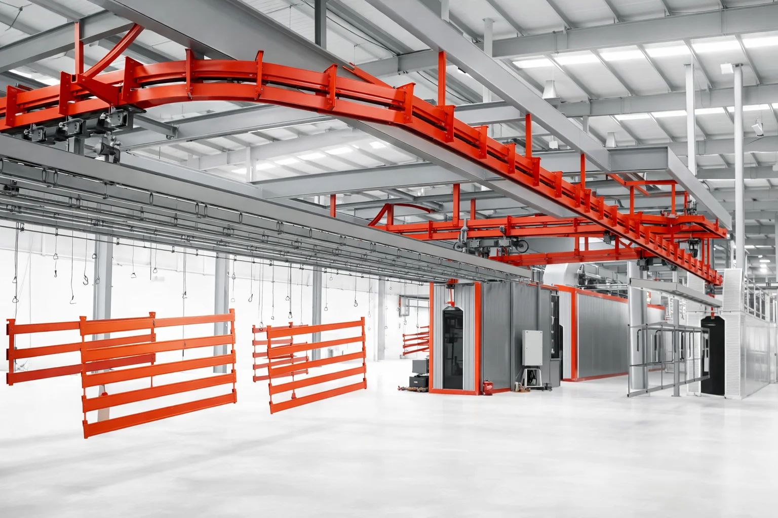 Подвесной конвейер — это система транспортировки, при которой изделия перемещаются в подвешенном состоянии на цепных или роликовых подвесках, установленных на направляющих под потолком.