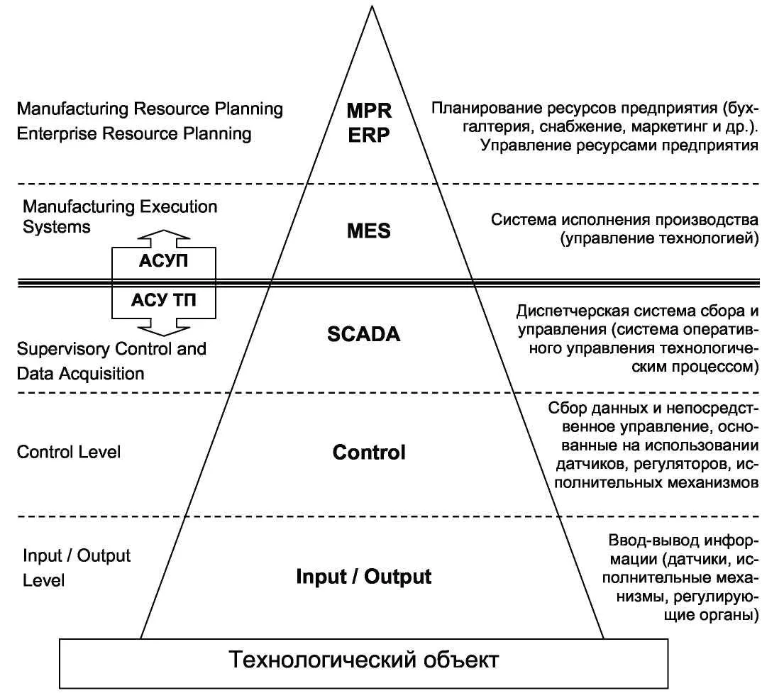 - АСУ ТП (Автоматизированные системы управления технологическими процессами), выполняющими управление оборудованием на уровне цеха и линии.