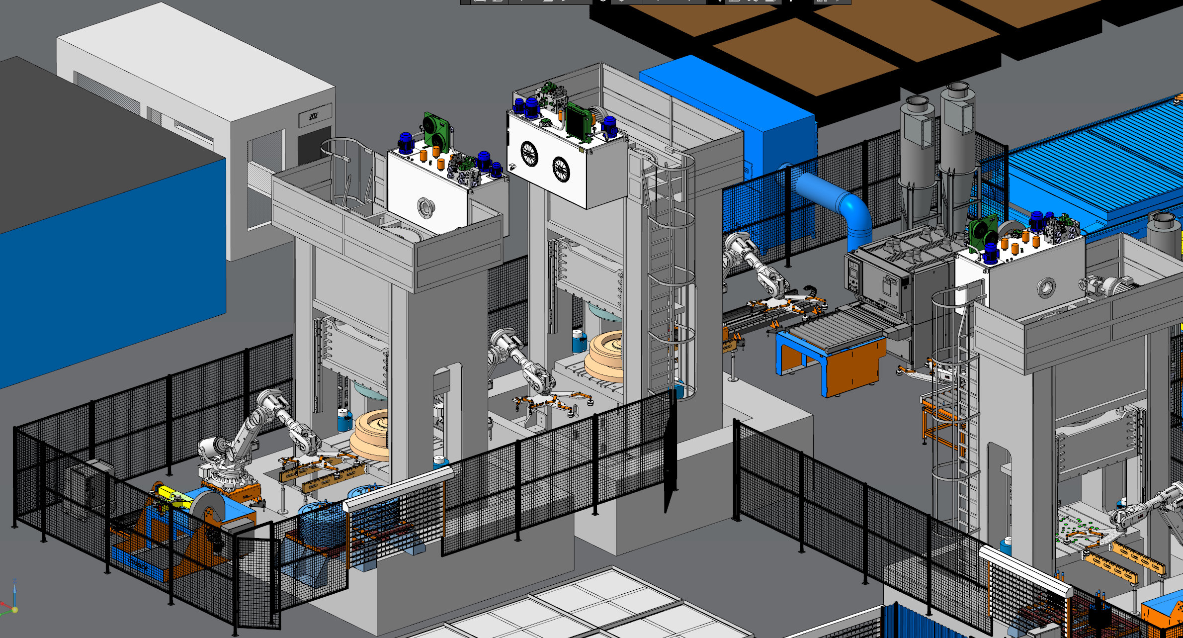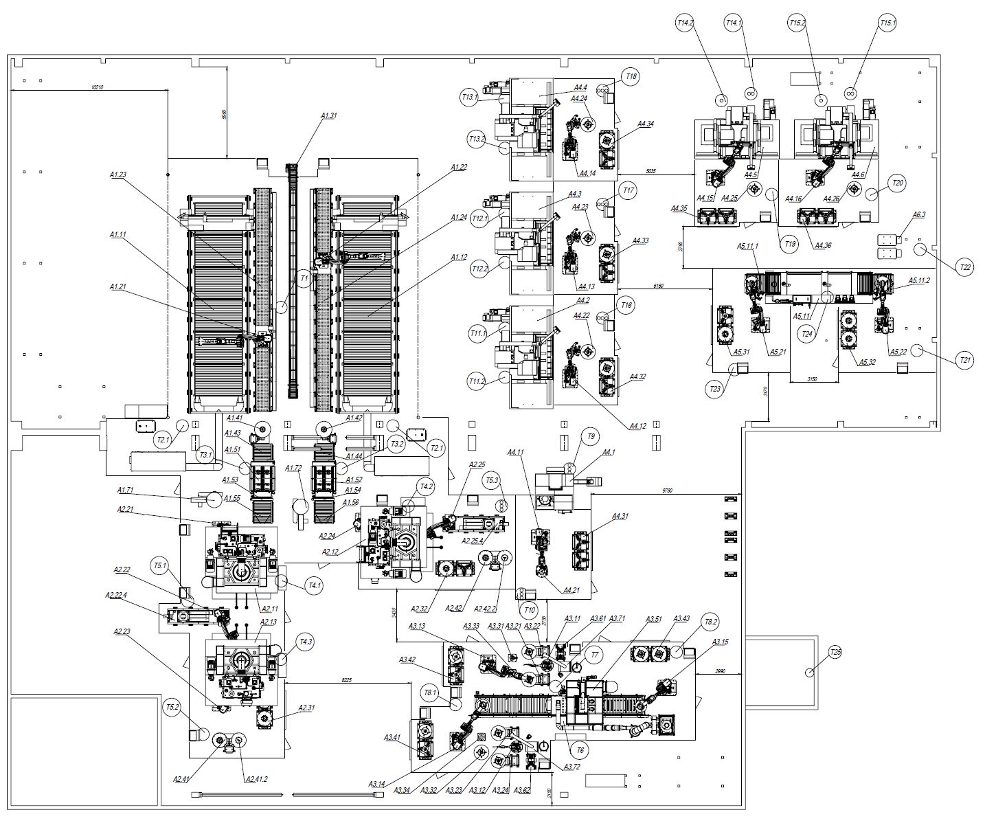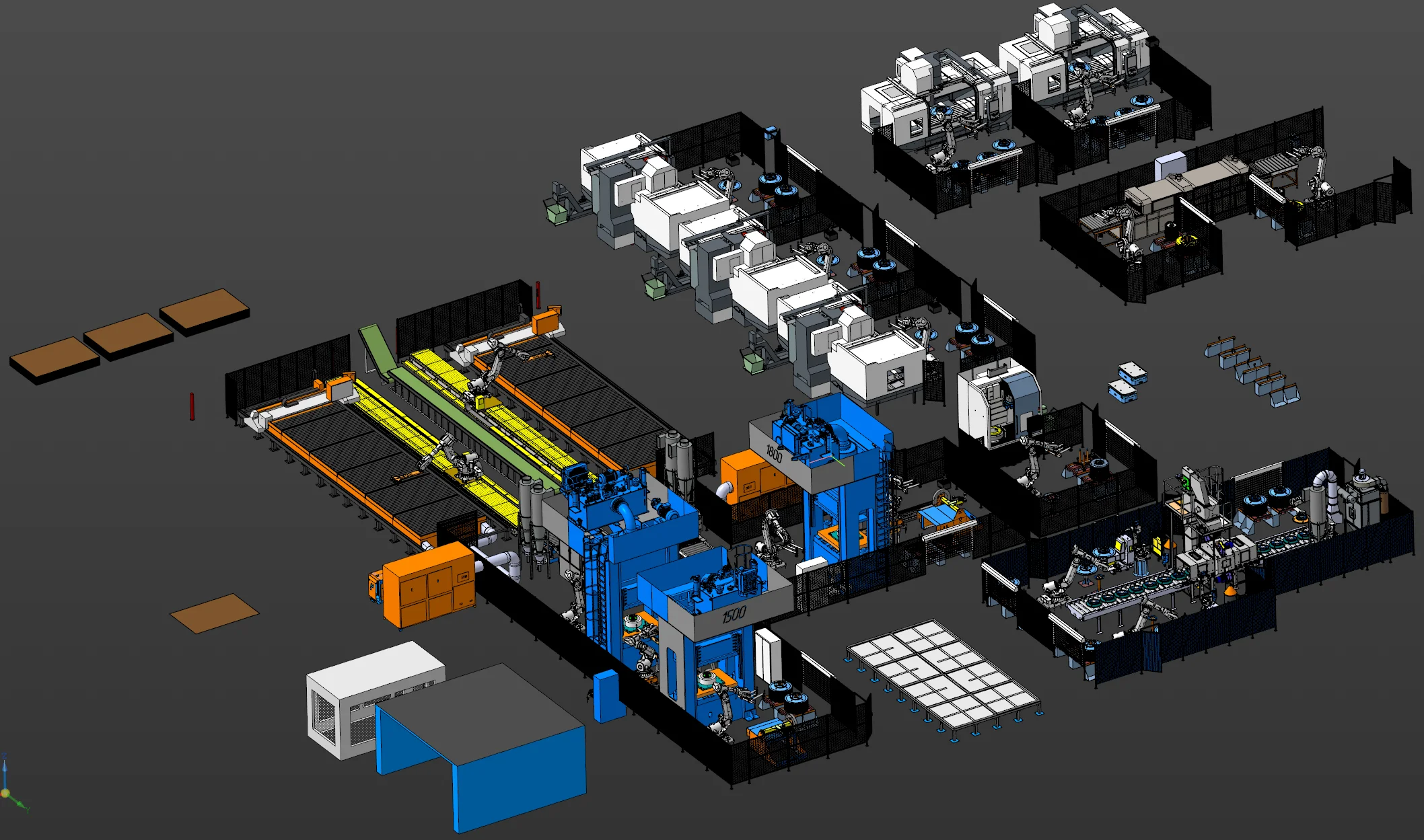 Комплексы обработки включают резку, штамповку, сварку, мехобработку и мойку. Роботы-транспортеры перемещают заготовки между операциями, используя маршруты, заложенные в программной документации.